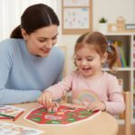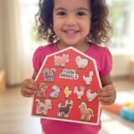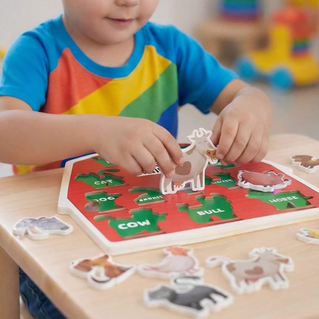 A criança aprende os nomes dos animais da fazenda em inglês, desenvolvendo coordenação motora, raciocínio lógico e vocabulário básico.